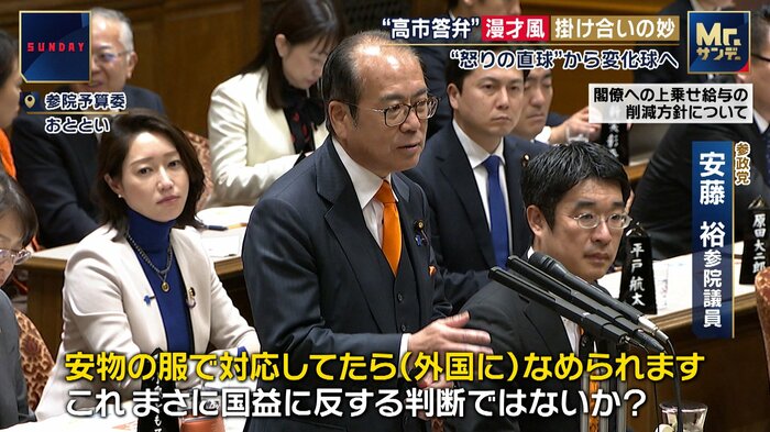 これから国民の給料を上げていかなきゃいけない。その中で(閣僚の)給料を引き下げるのは、むしろ逆のメッセージを出していると思う。これからしっかりと外交交渉してもらいたい。安物の服で対応していたら(外国に)なめられます。これ、まさに国益に反する判断ではないか?