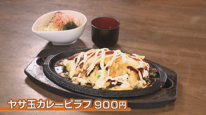 ヤサ玉カレーピラフは、バターで炊いたご飯に野菜を混ぜ合わせ、その上にたっぷりのカレー、そして野菜入りの卵を上からかぶせた一品。熱々の鉄板で提供されるカレーオムライスだ。