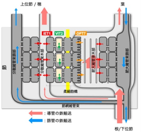 - IET1は、この導管に節内で維管束間輸送された鉄を再度積み込むことで、新しい葉や穂への鉄の分配に重要な働きをします。