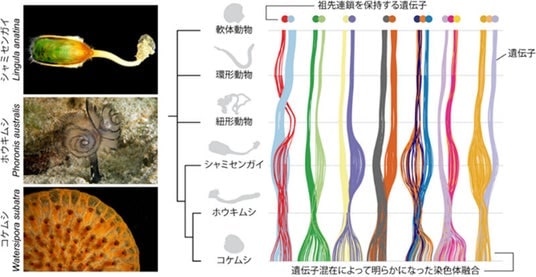 図.ホウキムシ(箒虫動物)とコケムシ(外肛動物)が姉妹群であることを示す染色体融合。画像クレジット:シャミセンガイ(Dr. Yi-Jyun Luo,中央研究院,台湾)、ホウキムシ(Chaloklum Diving)、コケムシ(Dr. John Bishop,MBA,英国).