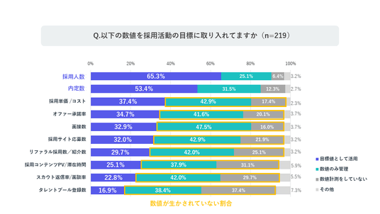 企業の採用活動におけるKPIは「採用人数」(65.3%)、「内定数」(53.4%)といった成果指標に偏重しており、活動の改善に資する中間指標のデータを活用できていない企業が半数を超えました。