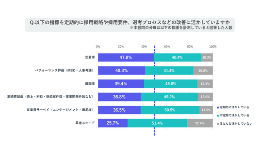 定着率や評価など社員入社後の数値は、「どのような人材がどのような価値を生むのか」の検証に寄与し、採用戦略や採用要件を見直す上で重要な数値です。しかし、データ活用している企業の割合は、「定着率」(47.8%)、「パフォーマンス評価(MBO・人事考課)」(40.3%)、その他数値も低調でした。多くの企業で採用と活躍、定着を結ぶ検証サイクルが未整備であることがわかりました。