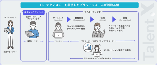 欧米では2013年頃から「Recruiting is Marketing(採用はマーケティング活動である)」の発想が定着しており、IT、テクノロジーを駆使したプラットフォームを活動基盤に、データドリブンで採用を推進する仕組みが普及しています。「採用マーケター」と呼ばれる採用マーケティングの専任担当者が配置され、候補者への情報発信やタレントプールの構築、スカウトを通じた関係形成を担います。その後の選考・採用・定着フェーズでは、リクルーターやコーディネーターが連携し、ソーシングからオンボーディングまでを一貫して設計・運用しているのが一般的です。国内においてもテクノロジーと専門人材を起点に、経営と一体となった「採用マーケティング」が浸透していくと予想されます。