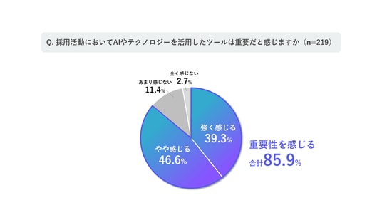 データ収集や分析に役立つAIやテクノロジーを活用したツールの重要性について、「強く感じる」(39.3%)、「やや感じる」(46.6%)と、採用担当者の約9割が重要性を感じていることが明らかになりました。経営と一体となった採用変革に向け、AIやテクノロジーの活用をした採用活動の基盤整備が急務となっています。