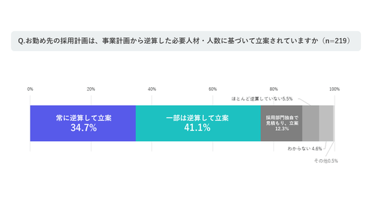 採用計画を経営戦略に基づく事業計画から「常に逆算して立案」している企業は34.7%に留まり、「一部逆算」、「人事独自で算出」、「逆算していない」の合計は60.2%となり、経営と人事の連携不足が課題となっています。