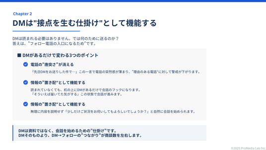 「DMは“読まれるかどうか”より、次の会話につながるかどうかで価値が決まります。フォローの設計を変えるだけで、DMは単発施策から“商談を動かす導線”に変わります。
