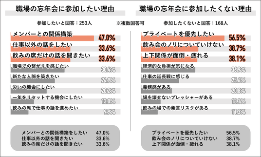 ・参加理由は「メンバーとの関係構築」が1位 不参加理由は「プライベートを優先したい」が1位