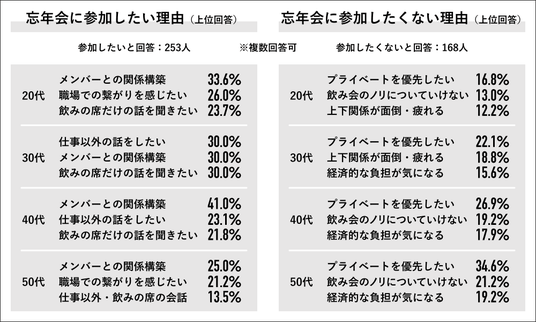 一方、参加したくない理由には「プライベートを優先したい」「飲みのノリについていけない」「上下関係が面倒などがありました。特に40~50代では、役職者としての立場や、ハラスメントに配慮した発言・振る舞いを意識せざるを得ないことから、飲み会でのノリに馴染みにくいという様子もうかがえました。職場の忘年会文化の必要性については数年に渡り意見が割れ続けていますが、「対面交流の重要性を感じる」「普段関わらない人との交流ができる」「仕事以外の話ができる」といった理由から、一定の支持も残っています。