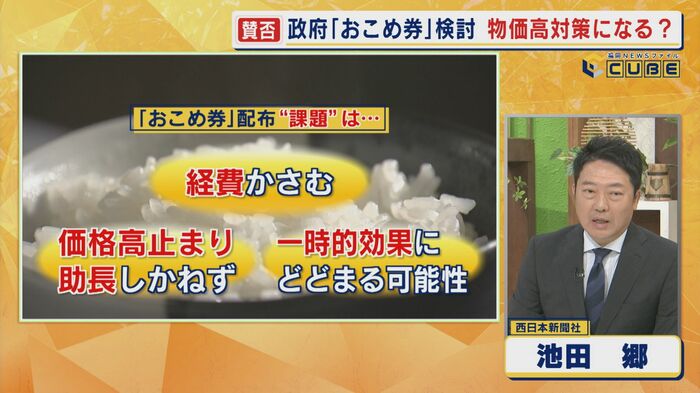 西日本新聞メディア戦略局長の池田郷さんは「物価高のなかで家計を助けるという分かりやすいメッセージとしてはいいかもしれないが、こうした政策によってコメ価格の高止まりが、助長されないか。また膨大にかかる事務費の原資は国民が負担することになる。それは果たしてプラスなのか。対処療法だとは思うが、“焼け石に水”となれば効果はマイナス」と話す。