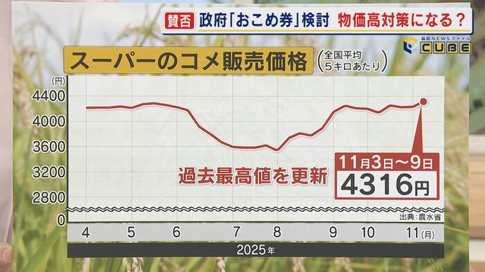 11月9日までの1週間に、全国のスーパーで販売されたコメ5キロ当たりの平均価格は前週より81円上がって、4316円と過去最高値を更新した。新米価格の高止まりが要因とされている。