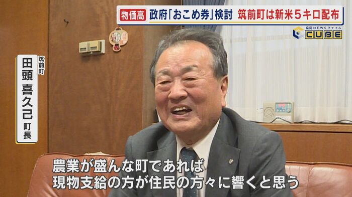こうしたなか「町民、全てに1人ずつ、1人に5キロ、配らせて頂こうと思っている」と話すのは、福岡・筑前町の田頭喜久己町長だ。コメ作りが盛んな筑前町は、物価高対策の一環として、おこめ券ではなく現物のコメを配布する独自の政策を進めている。