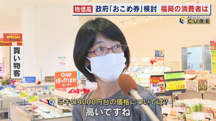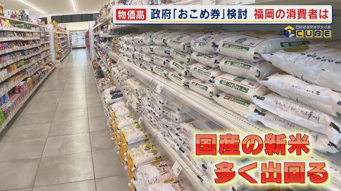 買い物客に聞くと「最近ずっとカリフォルニア米を買っている。おこめ券をもし頂けるのであれば助かる。地元九州のコメを買いたい」(男性)や「配布が1回で5000円分でも家計が助かる。政策としてはアリと思う」(女性)などと歓迎する人も多い。