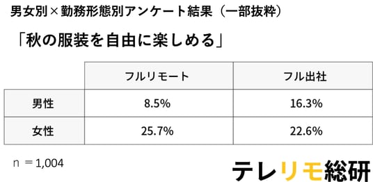 出社層より在宅層のほうが若干高い数値となったのは、服装の自由度が在宅のほうが高いからなのかもしれません。