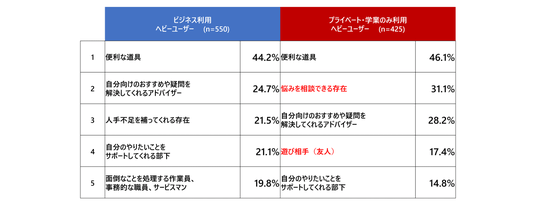 ヘビーユーザーに生成AIはどのような存在か聞いたところ、プライベート・学業利用ヘビーユーザーは生成AIを「悩みを相談できる存在」や「遊び相手」として、捉えているのに対し、ビジネス利用ヘビーユーザーは仕事をサポートする存在として捉える傾向があった。