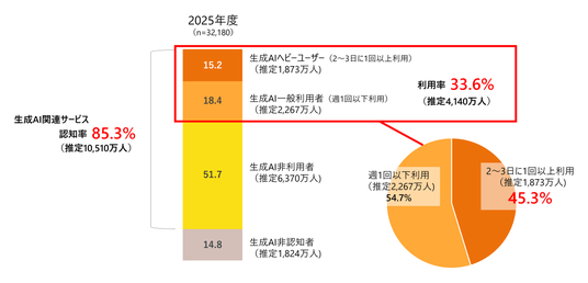 - 生成AI利用者は全体の33.6%。推定4,140万人が利用