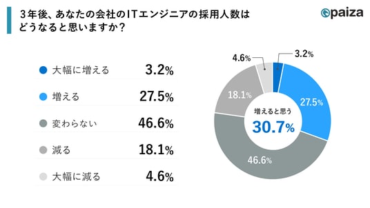 1. 3年後のITエンジニア採用人数予想:現場意見はAI時代でも「変わらない」が46.6%、「増える・大幅に増える」が30.7%