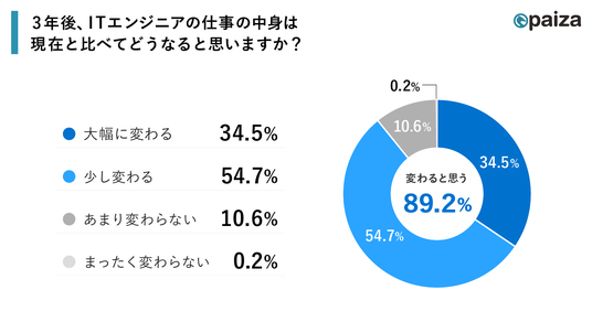 4.3年後のITエンジニアの仕事内容は「少し変わる」「大幅に変わる」が合計89.2%に上り、業務内容の変革への高い認識