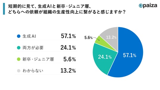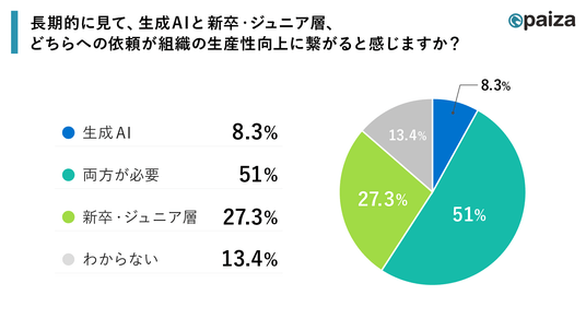 一方で、長期的に見て、組織の生産性向上について尋ねたところ、「長期的な組織の生産性向上には新卒・ジュニア層と生成AIの両方が必要だと思う」が51%で過半数を占め、最も多い回答となりました。