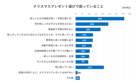 最も多かったのは「欲しいものの値段が高い(36%)」でした。 また、「物価高で予算を抑えたい(18%)」という声も多く、 昨今の物価上昇を背景に、プレゼントの価格や予算に頭を悩ませる保護者の姿がうかがえます。