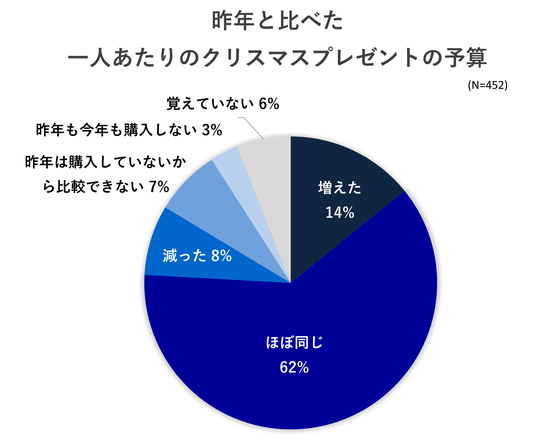 昨年と比べて、子ども一人あたりのクリスマスプレゼントの予算に変化があったのでしょうか。