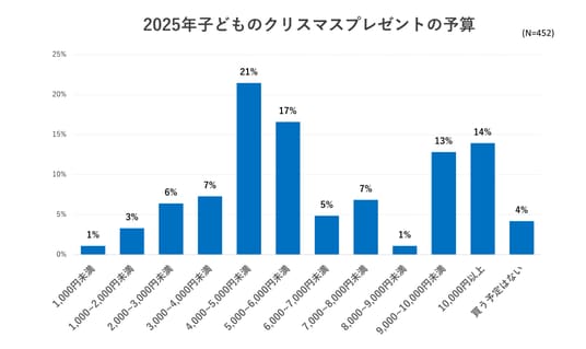 クリスマスプレゼントの予算は5,000~7,000円台が中心、平均額は5,887円で昨年より微増