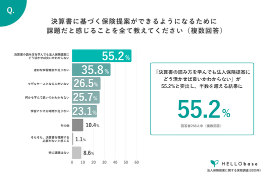 調査の結果、保険募集人がスキルアップ学習で直面する最大の課題は「決算書の読み方を学んでも法人保険提案にどう活かせば良いかわからない」こと(55.2%)であることや、決算書を読むこと自体に36.5%が自信を持てていないという実態が明らかになりました。