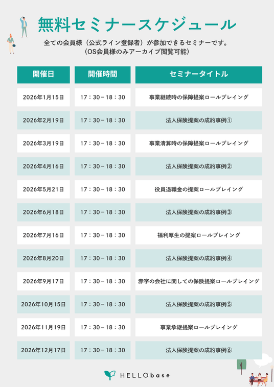 HELLO baseでは、保険募集人としての実力を上げるための無料セミナーを毎月開催しています。