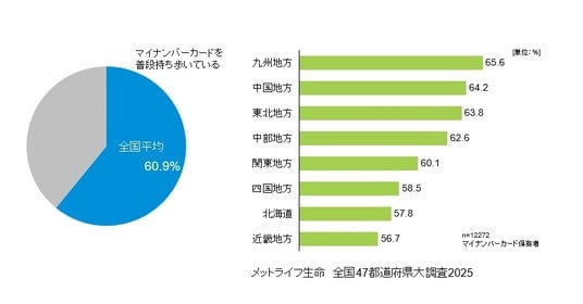 マイナンバーカードを普段持ち歩いている人は60.9%にとどまりました。マイナ保険証への移行を目前に控えながらも、日常的な携帯率の向上の余地はまだ残っています。地域別では、九州地方(65.6%)が高い一方、近畿地方(56.7%)は低く、約9ポイントの差が見られました。
