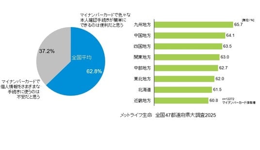 マイナンバーカードで各種本人確認が簡単にできることを便利と感じる人は62.8%に達しました。期待感の地域差はあるものの、便利と感じる人の割合は、「持ち歩き率」を上回り、今後さらに利用シーンや機能拡大への期待がうかがえます。地域別では、九州地方(65.7%)が高く、近畿地方(60.8%)はやや低めですが、全体として差は比較的小さくなっています。