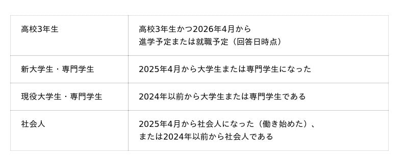 本調査では対象者を以下のように区分し、結果をまとめております。