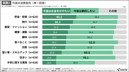【貯金・投資や旅行に「今後はお金をかけたい」、住まい・食事・スキルアップは節約志向】