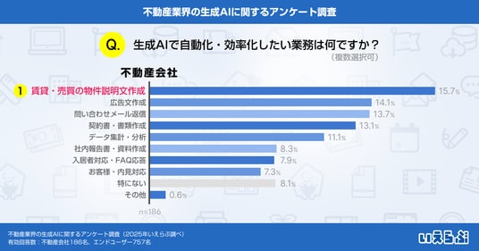 不動産会社に「生成AIで自動化・効率化したい業務は何ですか?」と質問したところ、最も多かったのは「賃貸・売買の物件説明文作成」で15.7%、次いで「広告文作成」が14.1%、「問い合わせメールへの返信」が13.7%という結果でした。