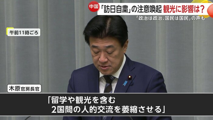 これに対し17日、木原官房長官は、「留学や観光を含む2国間の人的交流を萎縮させる」として、中国側に「適切な対応を求めた」ことを明らかにした。