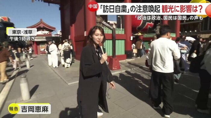 中国政府の注意喚起に、中国から来た観光客は「日本が好きだから残念です。政治は政治、国民は国民で違うでしょう」と話した。