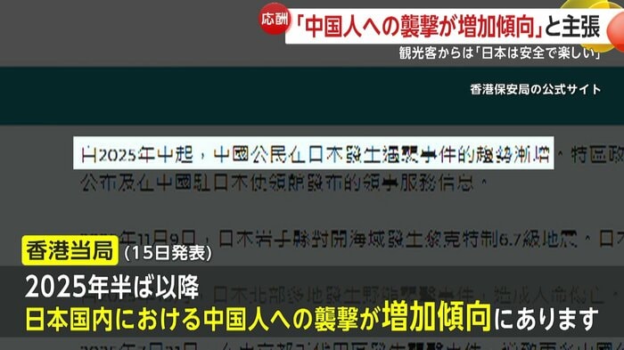 2025年半ばから、中国人への襲撃が増えていると主張した。