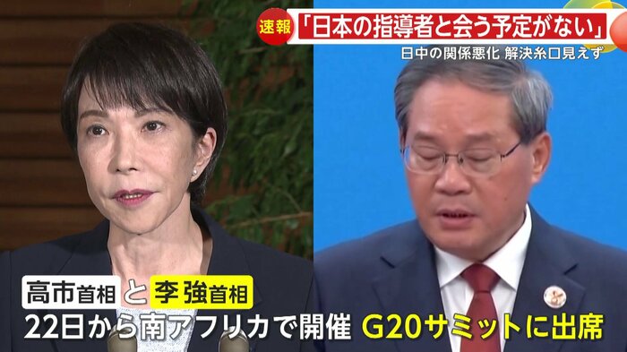 また、22日から南アフリカで開かれるG20サミットに、高市首相と中国の李強首相が出席するが、2人の会談の可能性について、中国外務省の報道官は…。