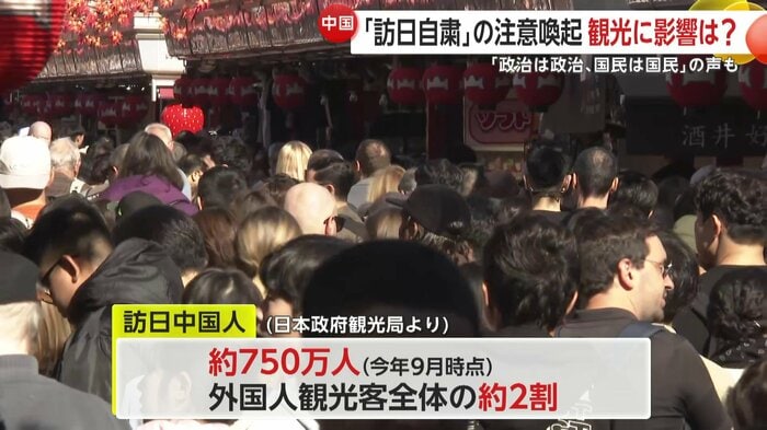 訪日中国人の数は2025年9月時点で約750万人と、外国人観光客全体の約2割。