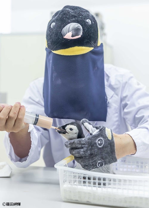初期人工育雛の際、スタッフは親鳥に扮して⾚ちゃんを育てます。 「生まれて初めて見た動くものを親と認識する」という鳥類の習性を利用し、スタッフがペンギン型の帽子を被り、ペンギンの嘴に見立てた手袋を装着します。声は一切発さずに録音した親鳥の鳴き声を聞かせながら食事を与えます。