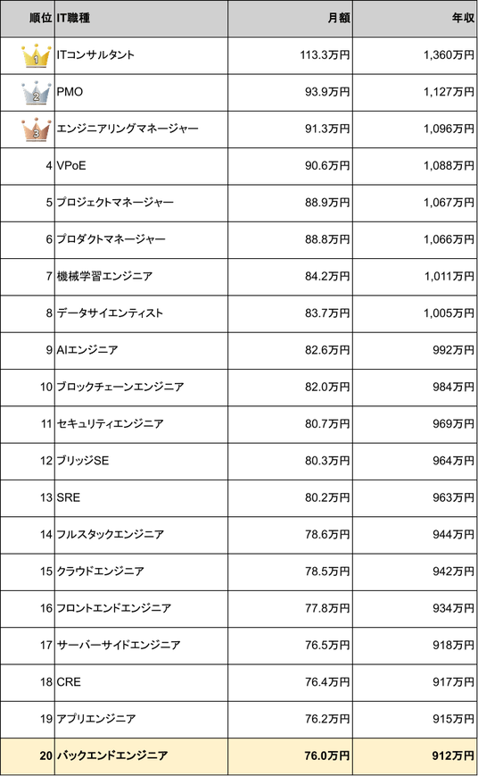 バックエンドエンジニア案件の平均月額単価は76.0万円、平均年収は912万円で、IT職種別の年収ランキングでは20位に位置しています。サーバー側の処理やデータベース設計を担う職種の中でも、安定した単価水準を維持している職種といえるでしょう。