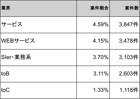 2025年11月時点のバックエンドエンジニアのフリーランス案件・求人は、サービス業界が4.59%(3,847件)で1位、Webサービスが4.15%(3,478件)で2位、SIer・業務系が3.70%(3,103件)で3位となっています。以下、toB向けが3.11%(2,603件)で4位、toC向けが1.33%(1,118件)で5位と続き、上位5業界で全体の約16.9%を占めている状況です。