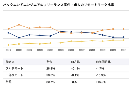 2025年11月時点のバックエンドエンジニア向けフリーランス案件・求人におけるリモートワーク比率は、フルリモートが28.8%、一部リモートが50.5%、常駐が20.7%となっています。