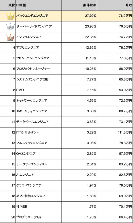 2025年11月時点でバックエンドエンジニアの案件は市場全体の27.0%を占め、IT職種別の案件数ランキングで1位となっています。平均月額単価は76.0万円と高水準で安定している状況です。