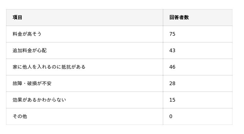 ・エアコンクリーニングに感じる不安は「料金が高そう」「追加料金があるか」が最も多いが「家に他人を入れるのに抵抗がある」と感じる人も一定数存在する。