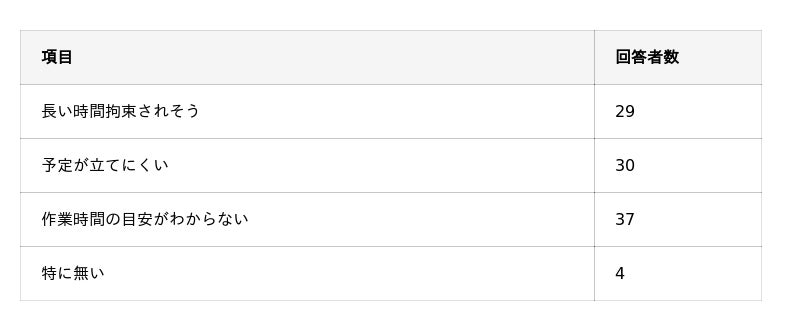 ・作業時間については「どれくらいの時間がかかるかわからない」と感じている人が多い。