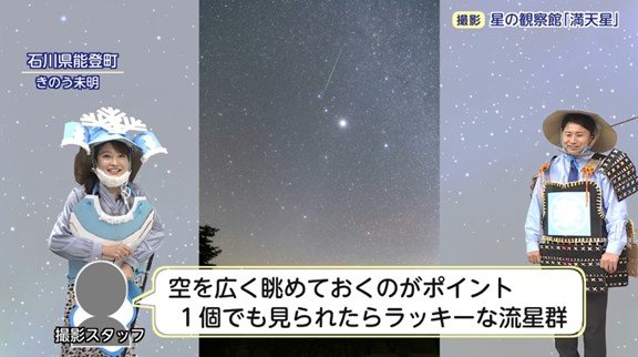 もし見ることができれば、写真のように流れ星の跡(流星痕)がくっきりと見えるのが特徴です。観測のポイントは「空を広く眺めておくこと」。1つでも見られたらラッキーな流星群だそうです。観測する際は、暖かい服装を忘れないようにしましょう。