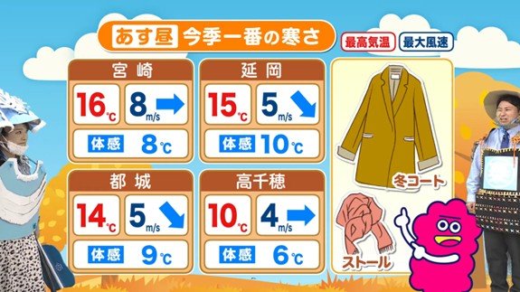 例えば、宮崎市の18日の最高気温は16℃の予想ですが、最大風速が8m/sなので、体感温度は「16 - 8 = 8℃」となります。高千穂では、最高気温10℃、最大風速4m/sで、体感温度はなんと6℃に。実際の気温の数字以上に寒く感じるのは、この冷たい風が原因だったのです。
