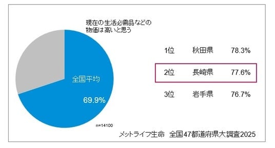 物価高への実感も顕著で、長崎県では77.6%が「生活必需品の価格は高い」と回答しました。これは全国平均(約70%)を大きく上回り、全国で2番目の高さです。