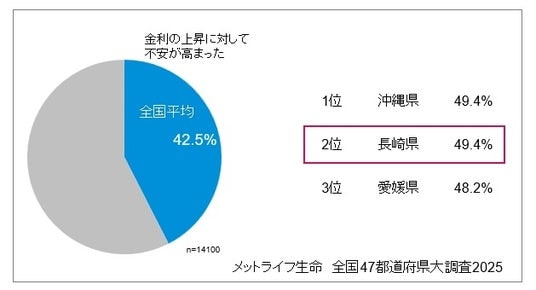 金利上昇への不安も広がりを見せており、長崎県では約半数の49.4%が「不安が高まった」と回答しました。全国平均(42.5%)を約7ポイント上回り、全国で2番目という高水準です。