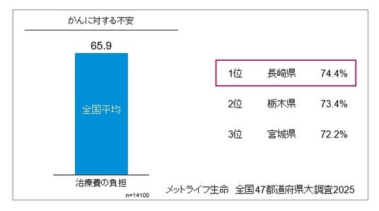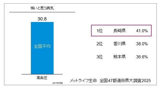 長崎県民の病気に対する不安で、全国に比較して大きいポイントが分かりました。がんに対するさまざまな不安の中で、「がん治療費が心配」と答えた人は74.4%で、全国平均(65.9%)を約8ポイント上回り、全国で最も高い割合となりました。また、「高血圧が怖い」と感じる人は41.0%に達し、全国平均(30.8%)を約10ポイント上回って1位という結果です。