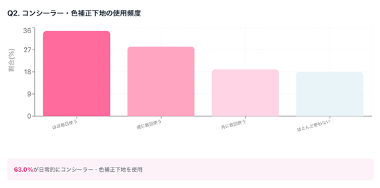 さらに、コンシーラーや色補正下地(コントロールカラー)の使用頻度についても調査したところ、「ほぼ毎日使う」が34.7%、「週に数回使う」が28.3%という結果になり、合わせて63%の方が日常的に部分補正アイテムを活用していることが分かりました。